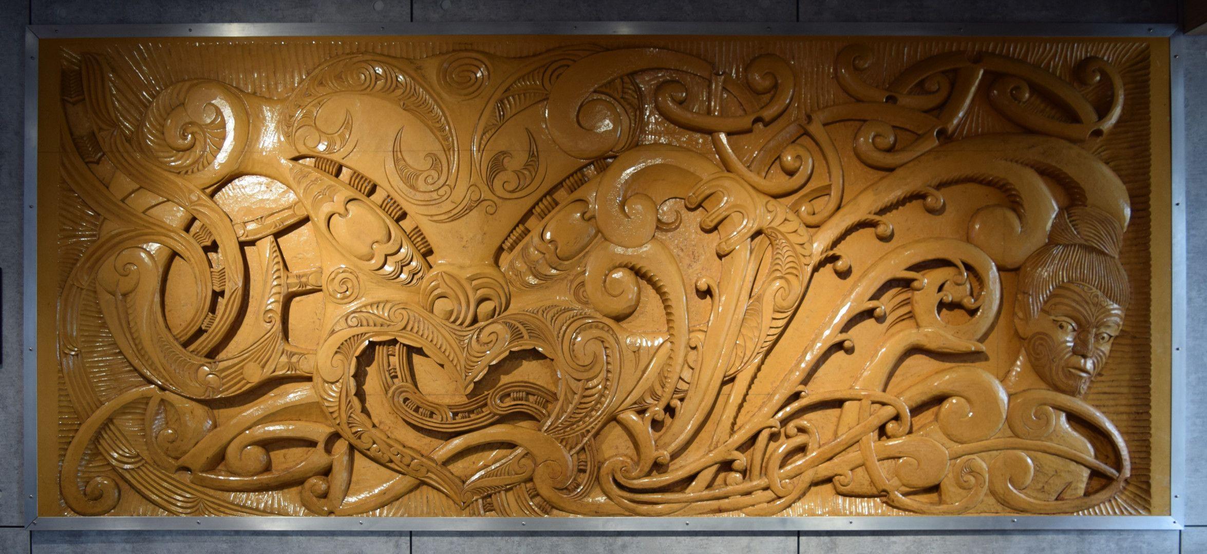 "Here, the depiction of Hatu Patu's flight from the clutches of Kurungaituku takes on a more traditional form with a highly decorative style of carving being prominent.
