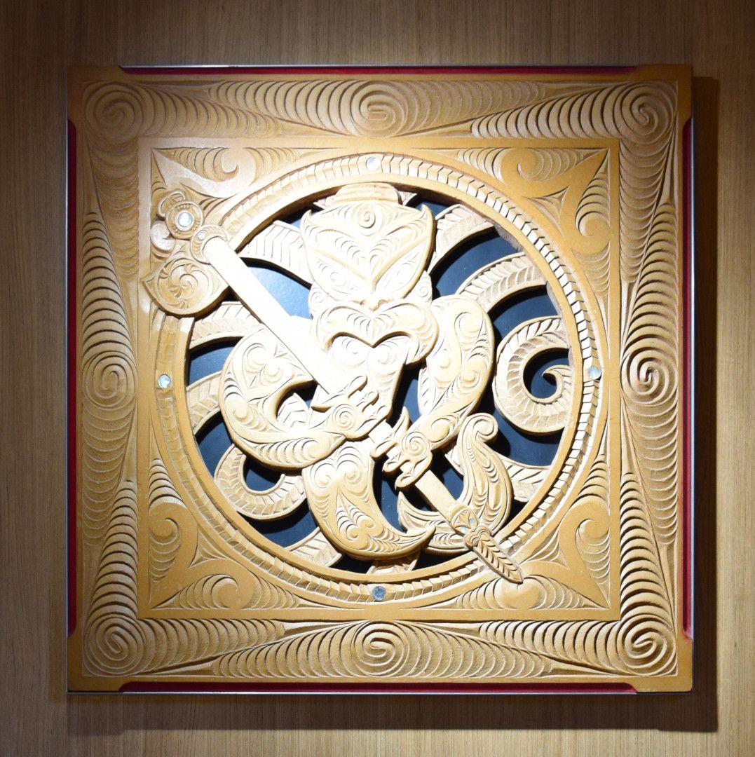 Whakairo wall relief of a warrior wielding a taiaha presumed to be the work of Tuti Tukaokao and made at the same time as other works commissioned by McDonald's Rotorua c. 1981.