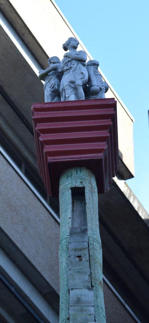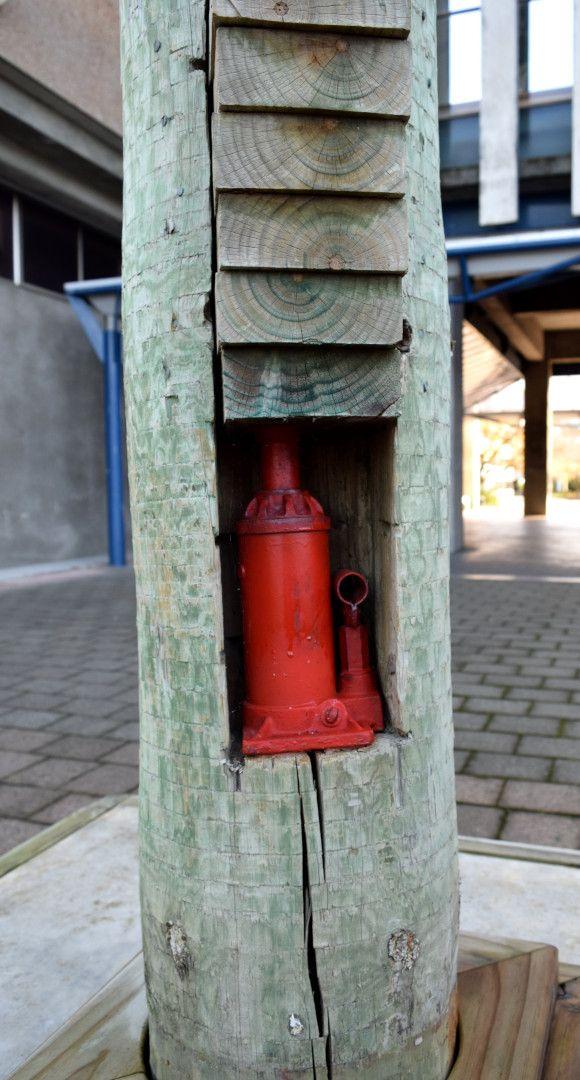 This work consists of a particularly tall column, internally stacked with cut pieces of timber and elevated, at the base, by a car jack. At the very top of the column is a greek/roman concrete statue of small scale, not unlike what you might find as a garden ornament.